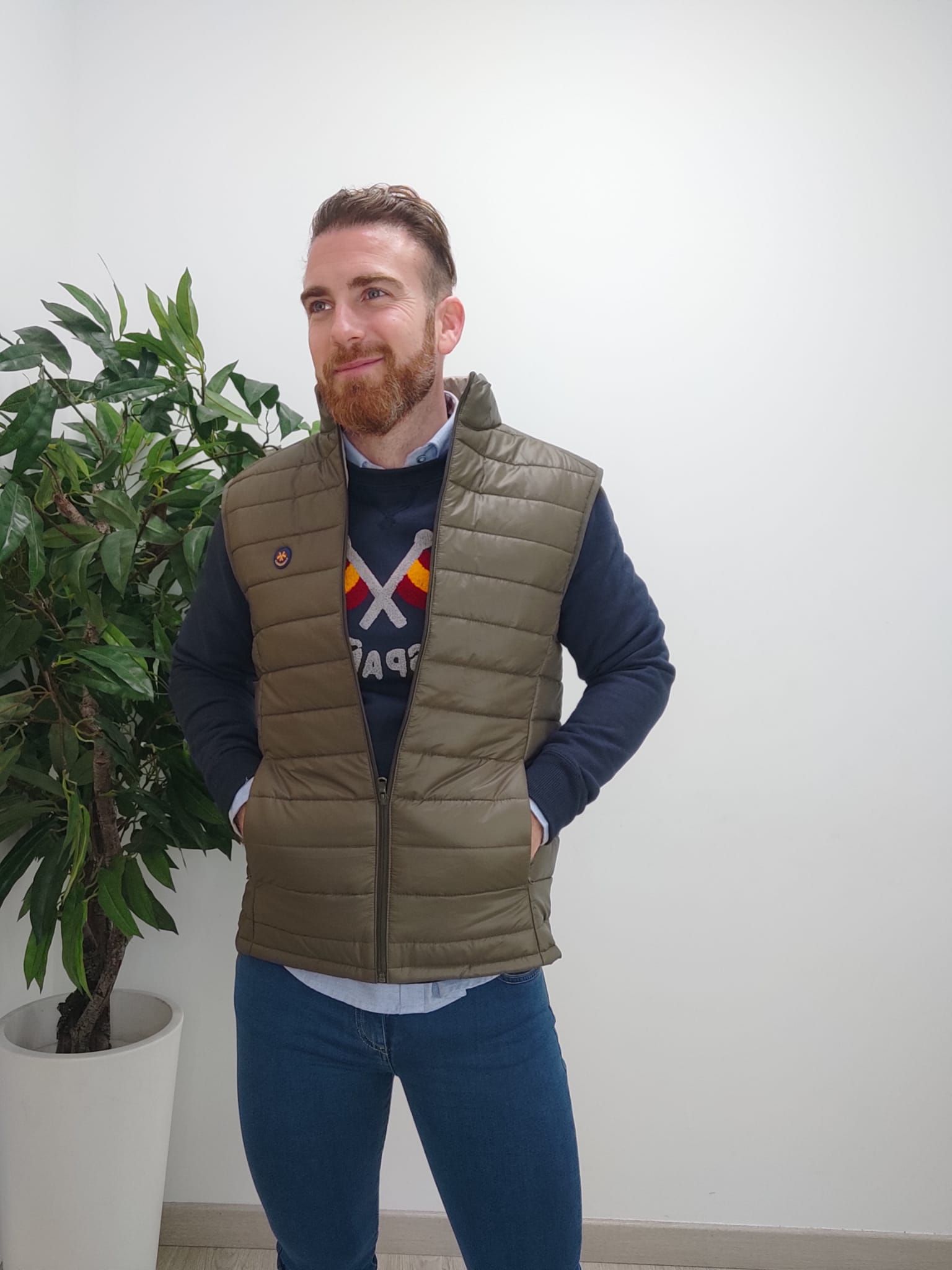 Chaleco guateado. Cuello subido. Bolsillos laterales. Cierre frontal en cremallera. Detalle de la marca en la parte frontal derecha. Fabricado en España.