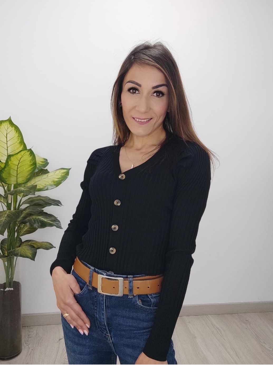 Top acanalado con escote a pico. Abotonado en la parte frontal. Manga larga con detalles en los hombrosbr / br / 83% Viscosabr / br / 17% Poliamida