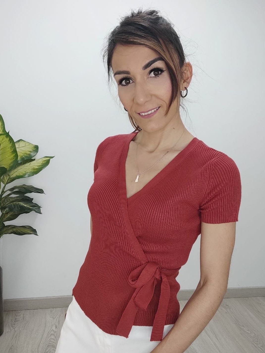 Top de punto acanalado de escote cruzado con lazada para anudar en la cintura. Manga corta.br / br / 70% Viscosa.br / br / 30% Poliamida.br / br / Talla XS 34/36br / br / Talla S 36/38br / br / Talla M 40/42br / br / Talla L 42/44