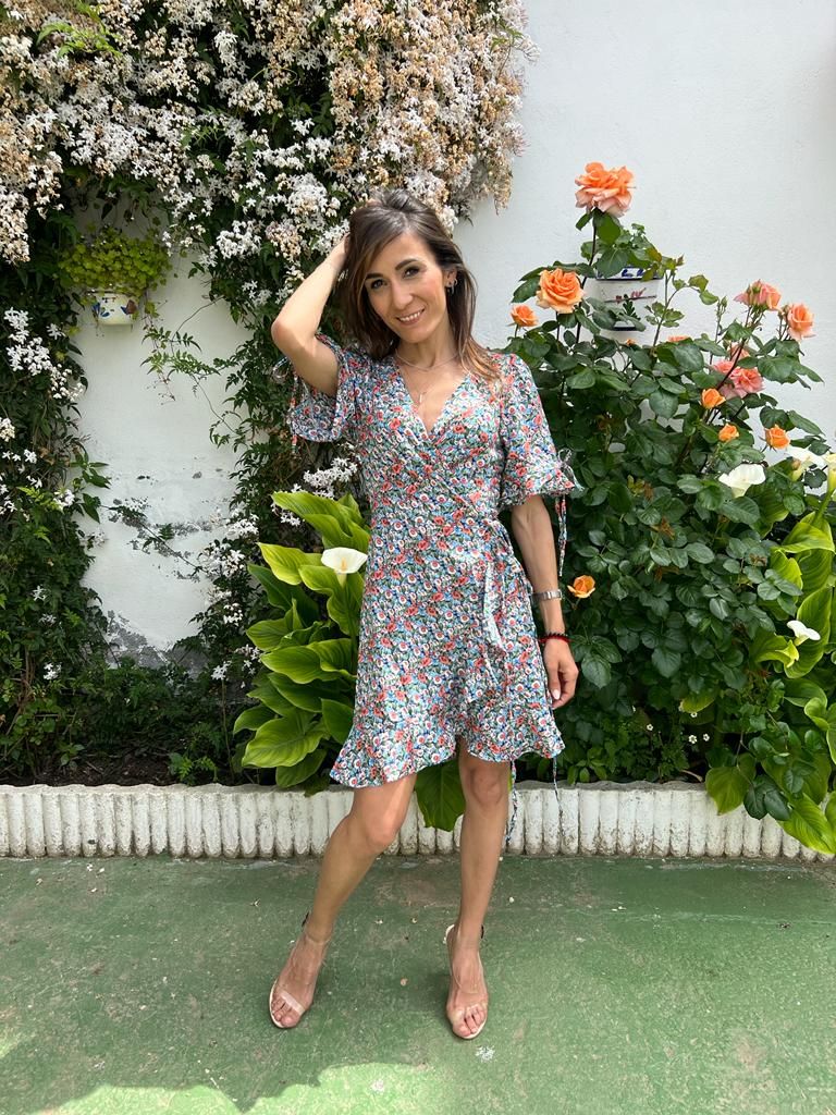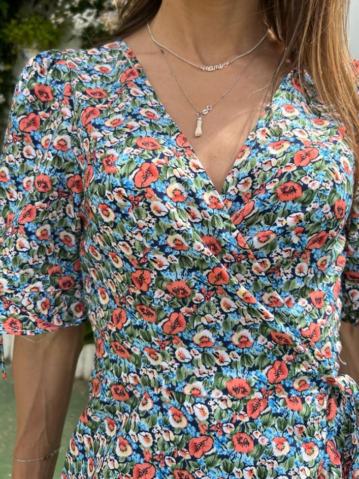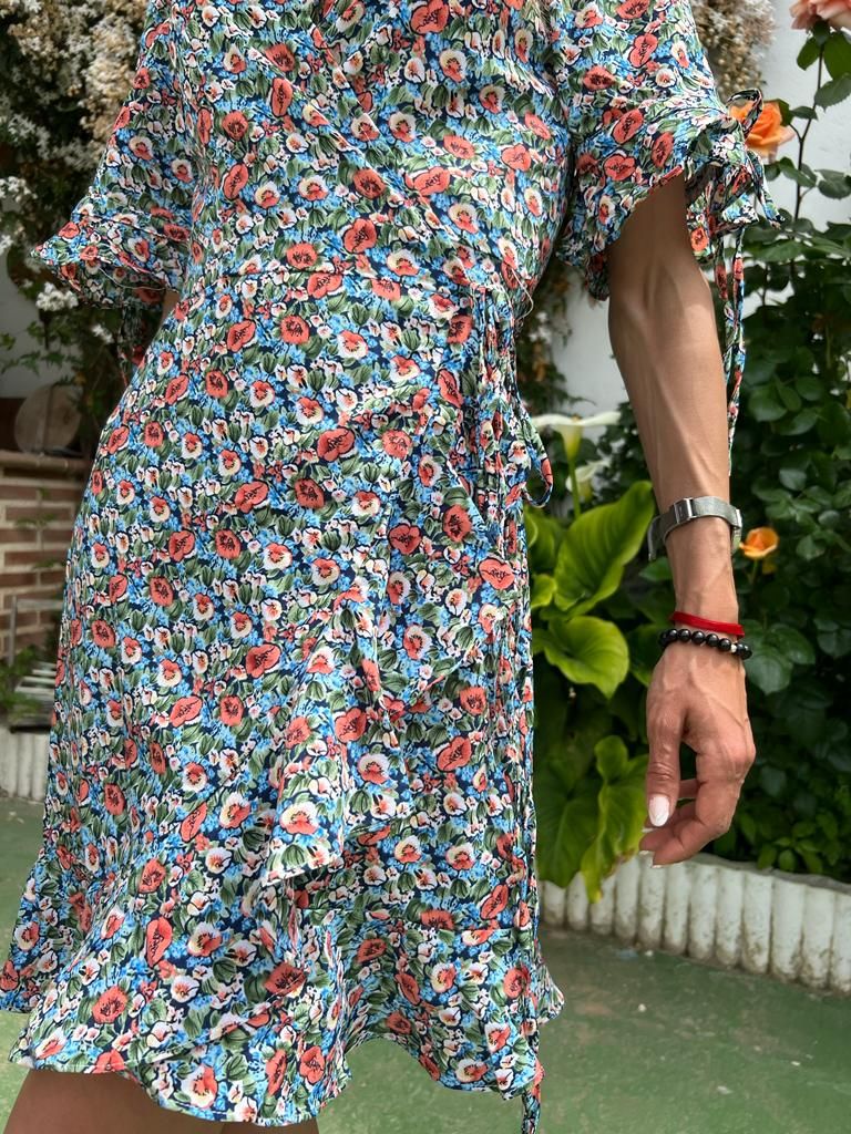 Vestido estampado floral. Escote cruzado.  Manga corta. Cierre en lazada en el lateral. Detalle de volante en la falda. 100% Poliester Talla XS 34/38 Talla S 40/42 Talla M 42/44 Talla L 44//46