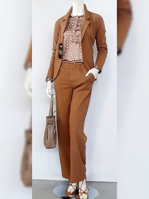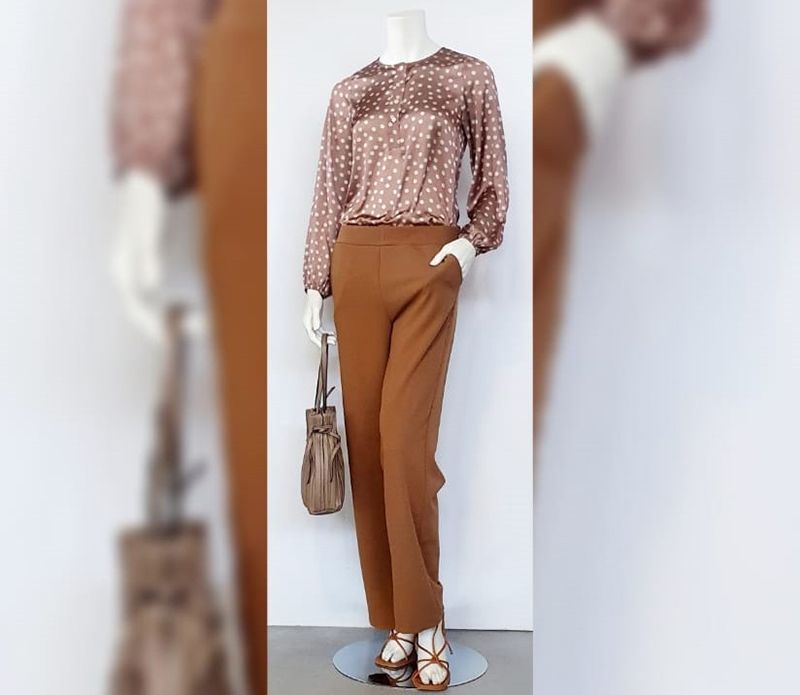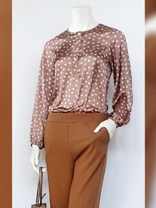 Blusa de satén marrón con topos en crema, manga larga con puño de goma y escote redondo con botones.
