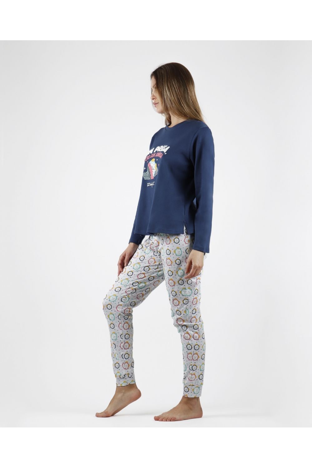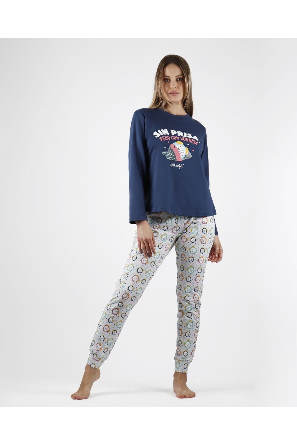 Pijama de mujer en punto de algodón, de manga larga, cuello redondo y pantalón largo. Camiseta de punto liso interlock, de color marino, con dibujo posicional con detalles en relieve,de despartor durmiendo dentro de una cama de la marca Mr Wonderful y la frase "Sin prisa, pero con sonrisa".Pantalón de punto estampado vigoré,de múltiples despertadores de diferentes colores, con cinturilla ajustable y puños. Tejido suave al tacto.
