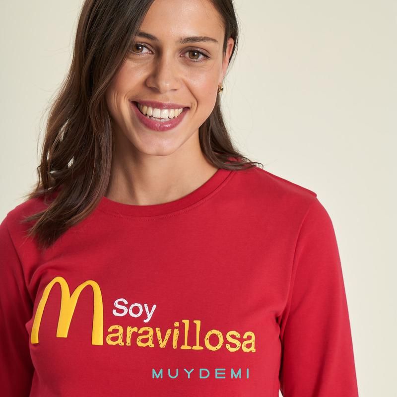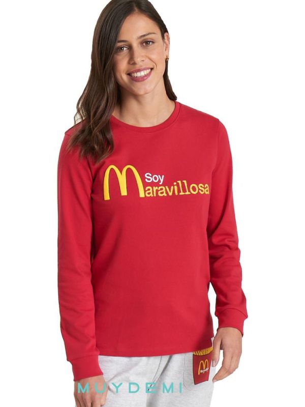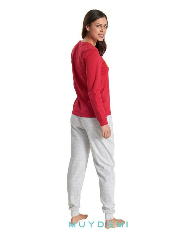 Pijama mujer en tejido interlock compuesto por sudadera roja con la frase "Soy maravillosa" y pantalón largo en gris con detalle en pierna izquierda con bolsillo y estampado de patatas fritas. Puños en sudadera y pantalón.