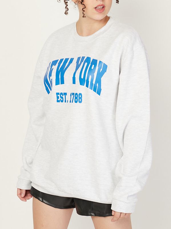 Sudadera oversize en gris claro con print "New York" en azul (el azul es más oscuro que en la foto)