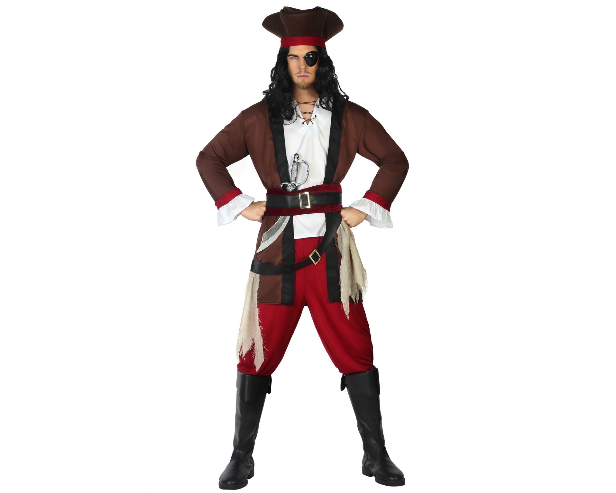 El disfraz de pirata para hombre contiene sombrero, chaqueta, dos cinturones y pantalón.