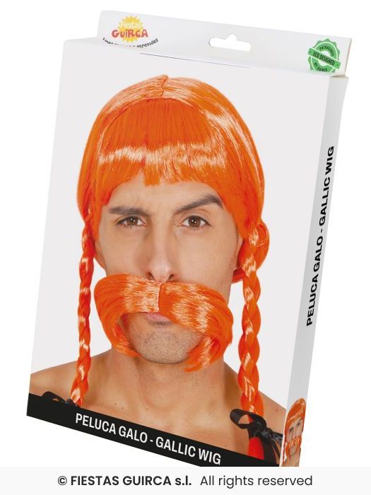 Complementa tu disfraz de Obelix con esta peluca y bigote de color naranja, ten tu disfraz completo para tus fiestas de disfraces o para el día de carnaval.