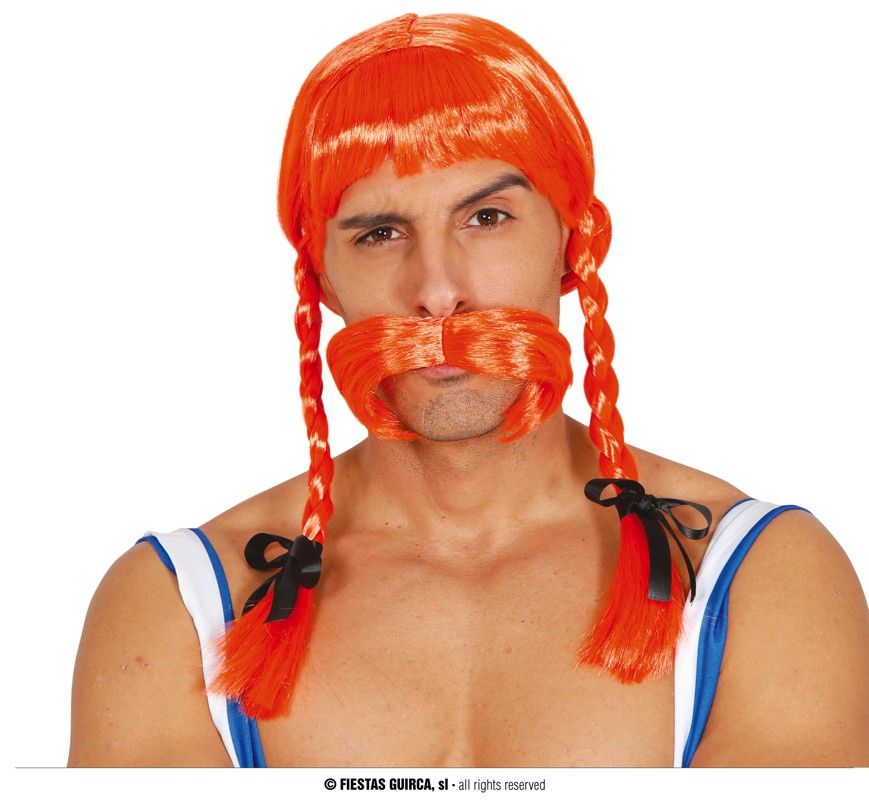 La peluca de galo naranja contiene peluca con trenzas y bigote naranja
