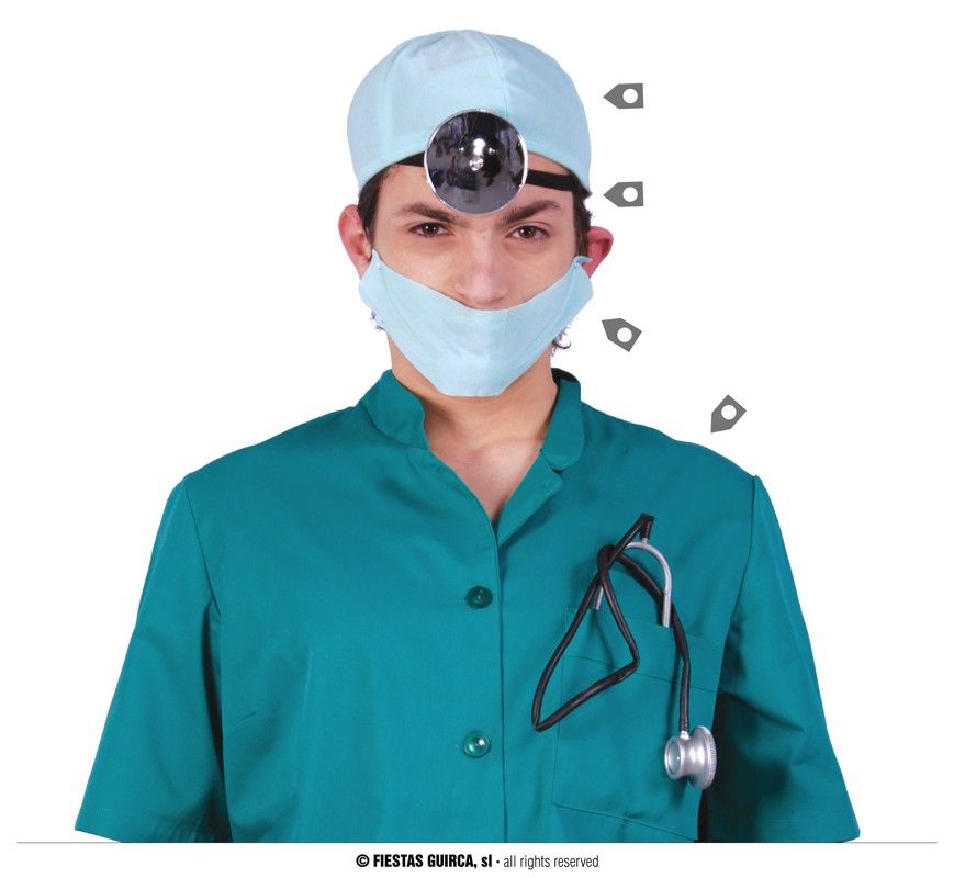 El conjunto de doctor contiene,gorro mascarilla, estetoscopio y espéculo