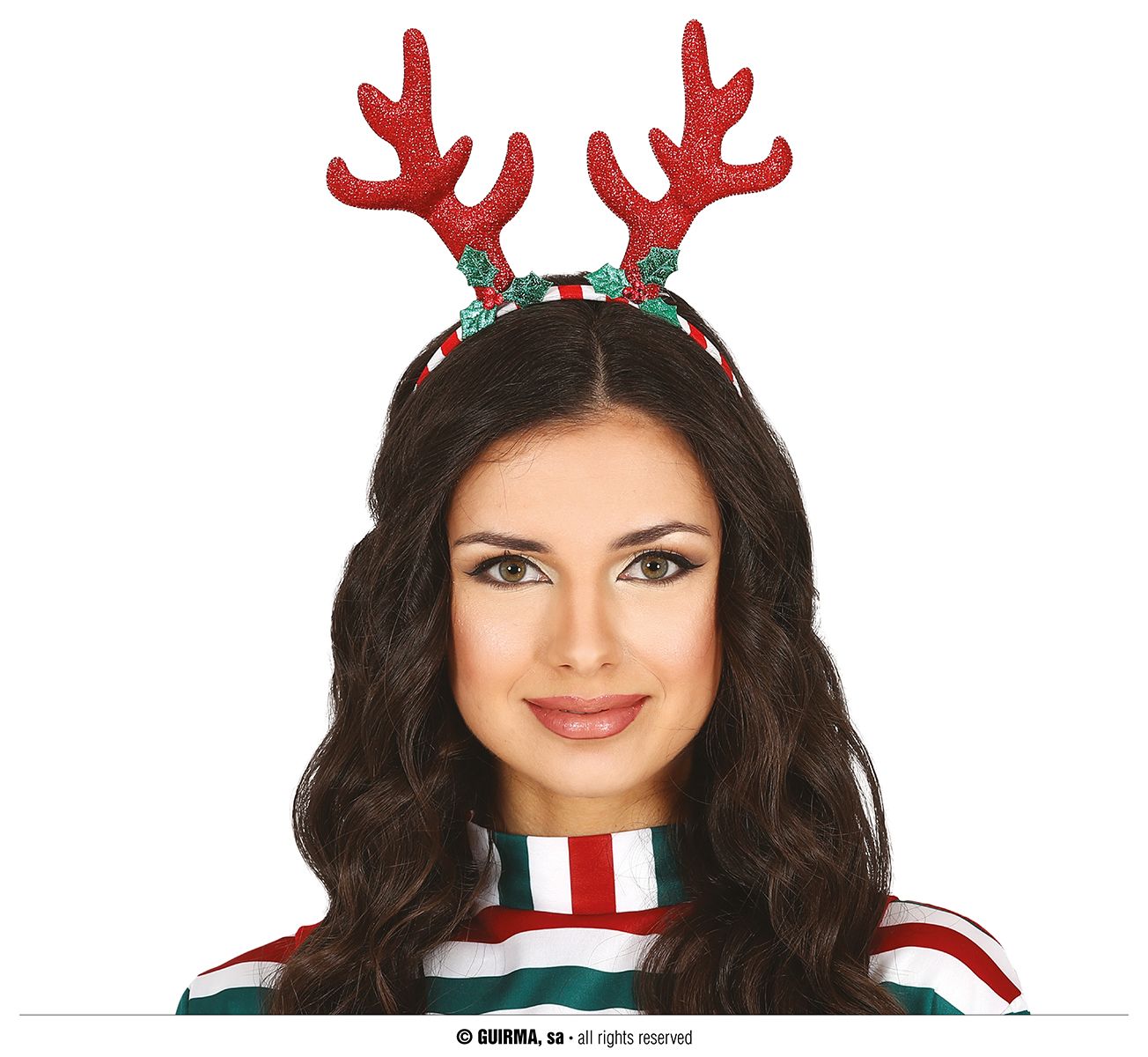 La diadema de cuernos de reno contiene una diadema con unos cuernos de reno rojo