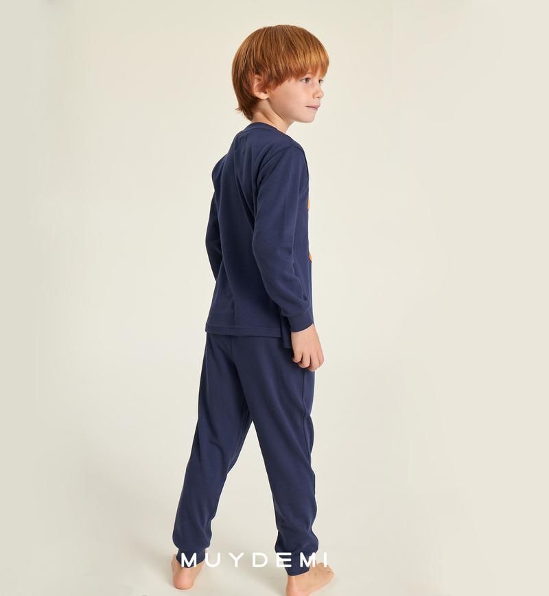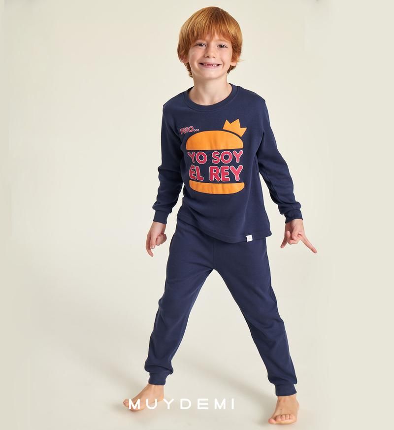 Pijama niño de la familia Burger. Compuesto por sudadera marino, el dibujo de una hamburguesa y la frase Yo soy el Rey y pantalón marino con puño a juego.