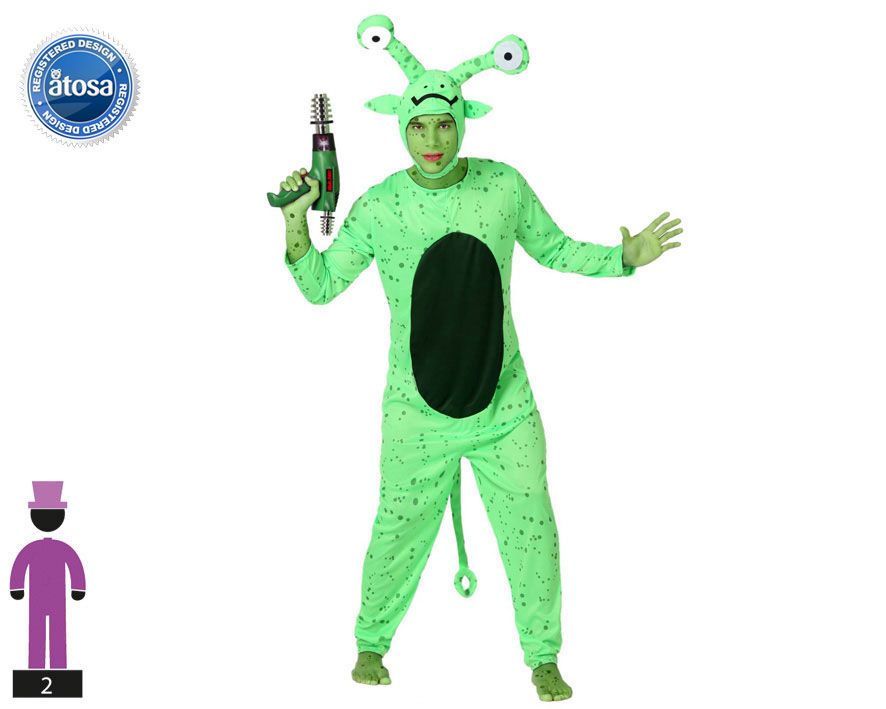 El disfraz de extraterrestre contiene mono de color verde con cremallera detrás y capucha con antenas.