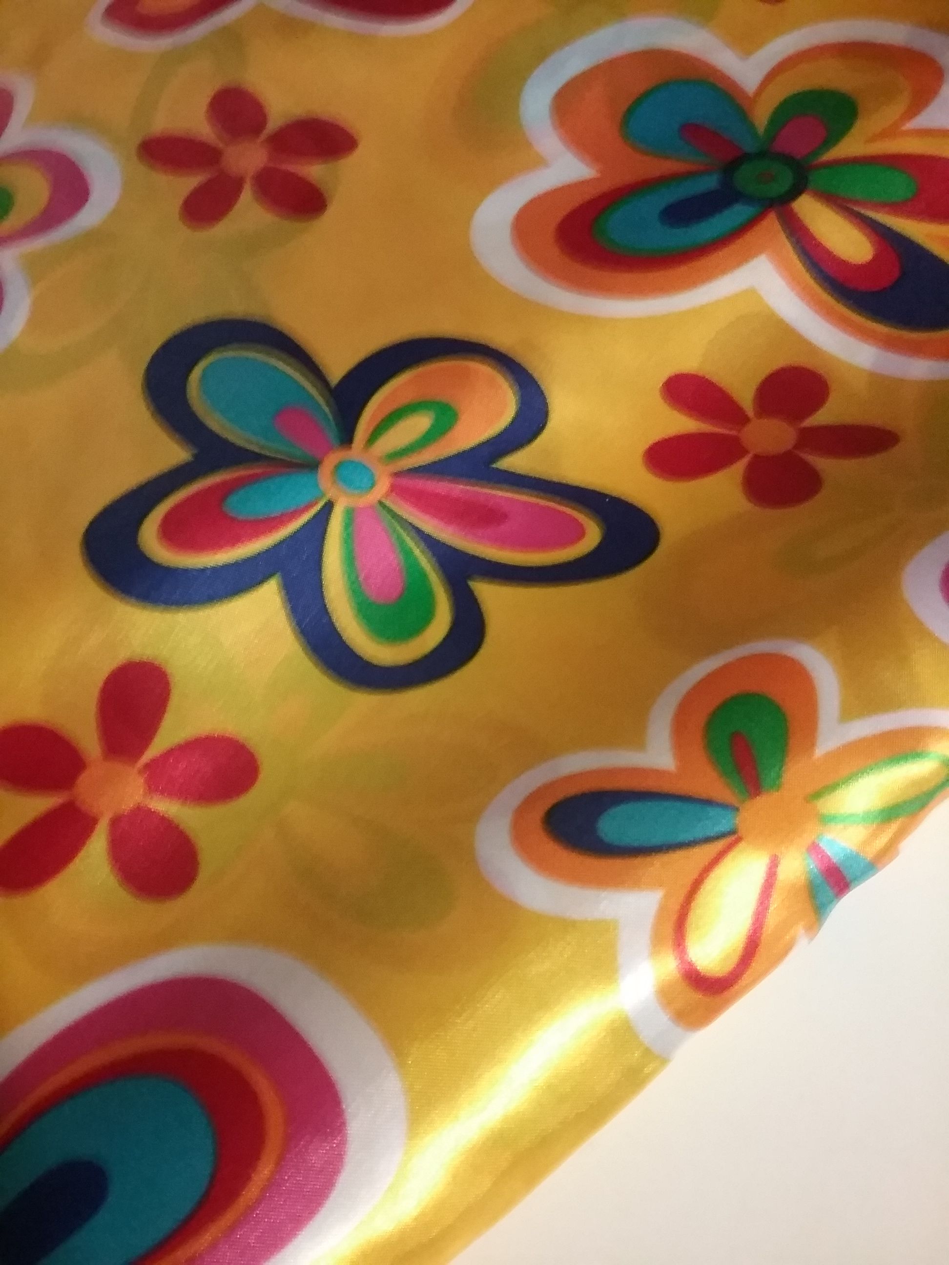 Raso estampado de margaritas. Tela con caída, ideal para la confección de trajes para comparsas, disfraces como el de hippy ,carnaval y manualidades.
