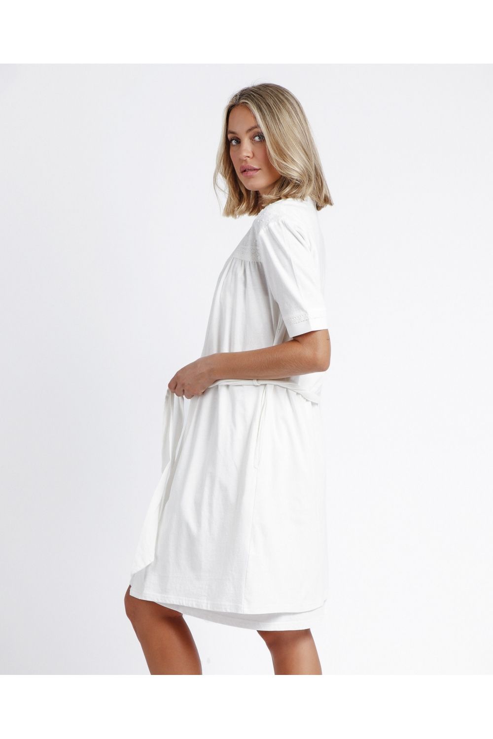 Bata combinada de tela y plumetti, de manga corta, de color blanco. Bata con detalle de puntilla crochet. Cuenta con cordón. Tejido suave al tacto.