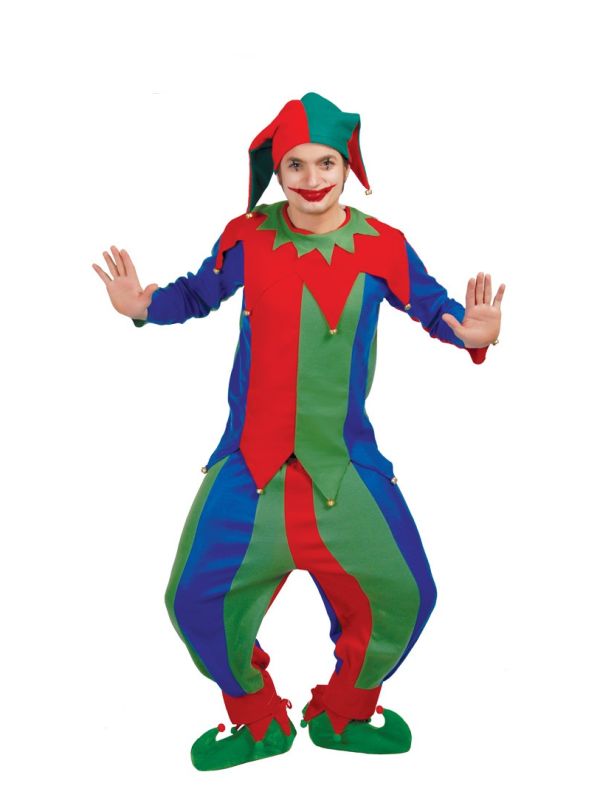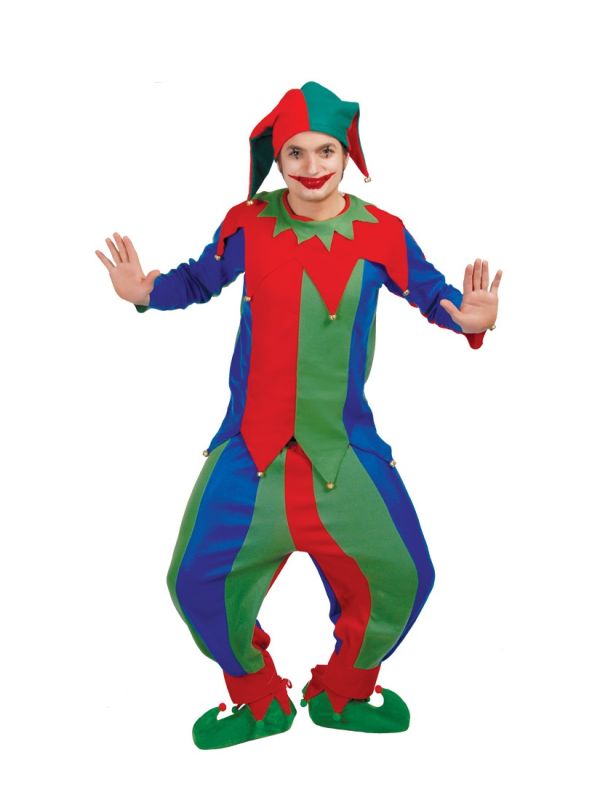 El disfraz de bufón contiene, pantalón, camisa, gorro con cascabeles