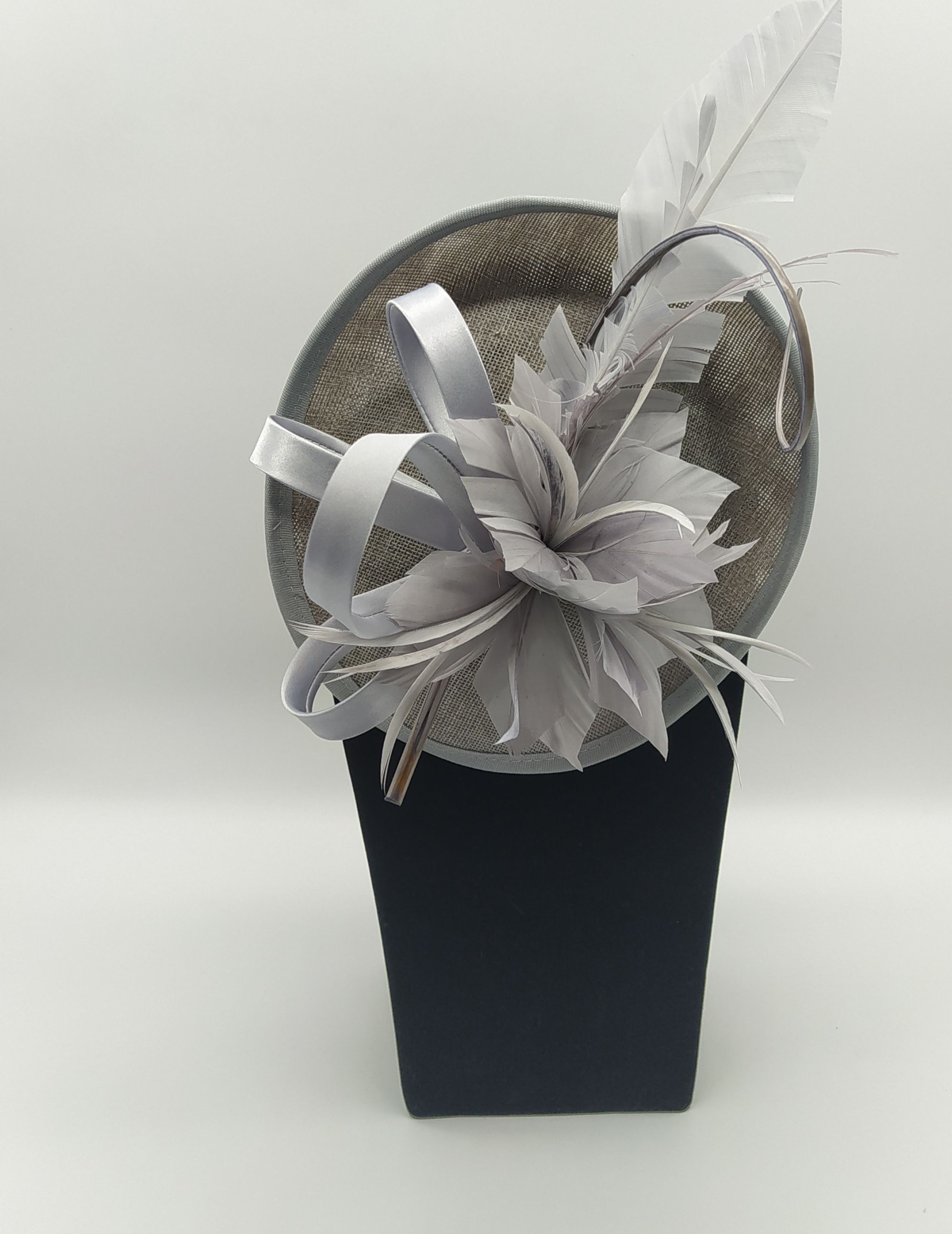Tocado plata con pluma y flor central . Con pinza y diadema